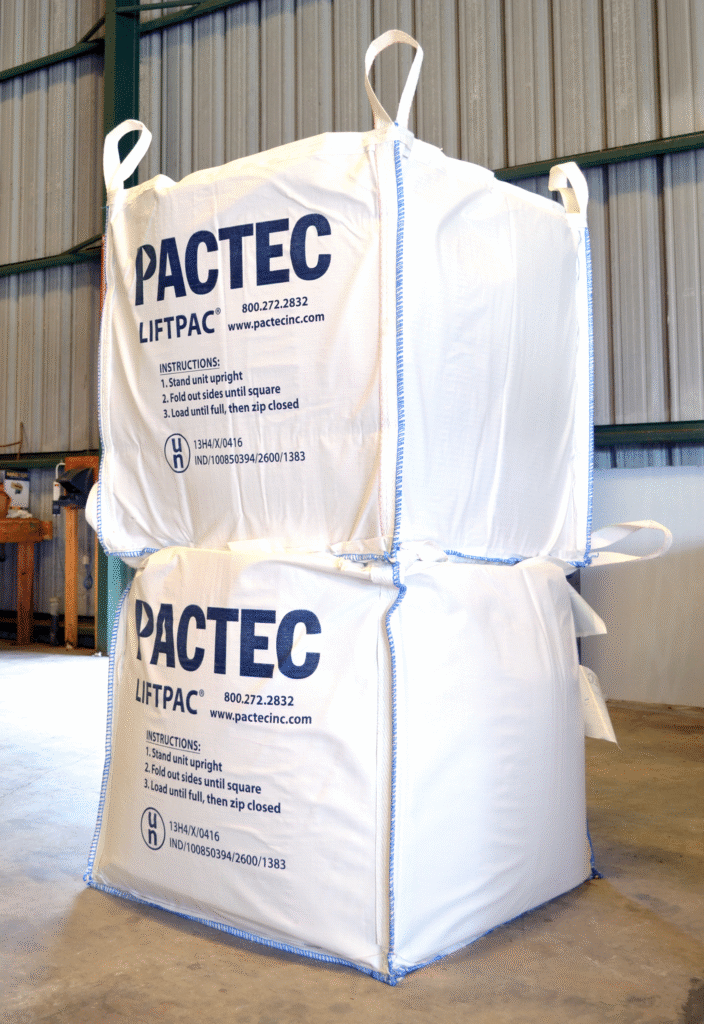 The LiftPac® SSX is PacTec’s extra-large, self-standing flexible intermediate bulk container (FIBC), designed to handle substantial volumes of industrial waste. Building upon the proven design of the LiftPac® SS, the SSX offers increased capacity while maintaining the same robust construction and ease of use. Its rigid sidewalls and integrated liner ensure stability and leak protection, making it ideal for high-volume waste management applications. We also have a UN-tested model of the LiftPac SSX, available if needed.